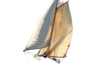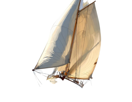 Dynamic Sailing Yacht with Billowing Sails in Motion, Angled Front View, Transparent