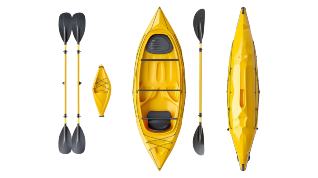 Three vertical views of yellow rad crossover kayak with paddle on white background