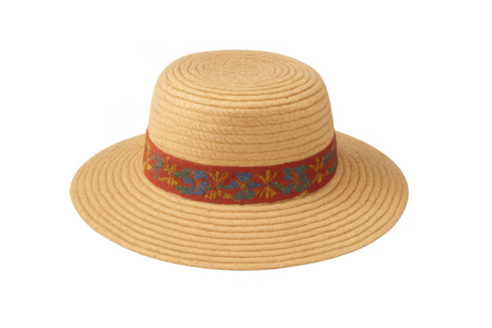 Elegant straw boater hat with red ribbon isolated PNG, classic summer headwear for sun protection and stylish fashion accessory