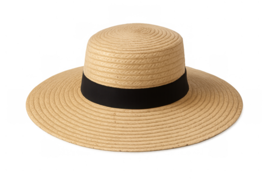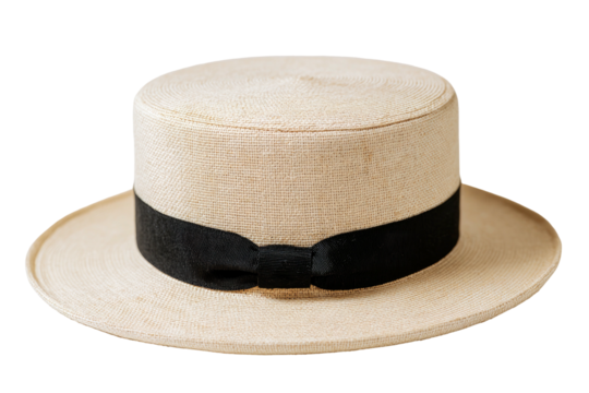 Straw boater hat with a wide ribbon around the crown on transparent background.