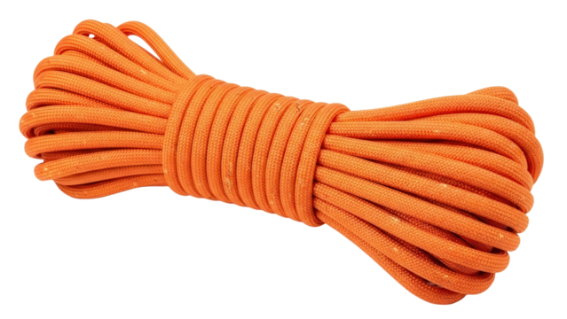 Bright orange coiled utility rope lying neatly, cut out, stock png, isolated on transparent background