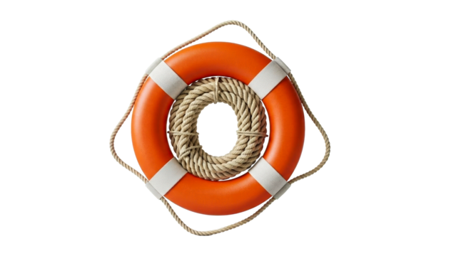 Bright orange and white life buoy ring with white rope isolated on transparent background