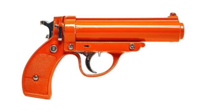 Orange signal flare gun providing emergency rescue equipment for marine safety isolated on transparent background