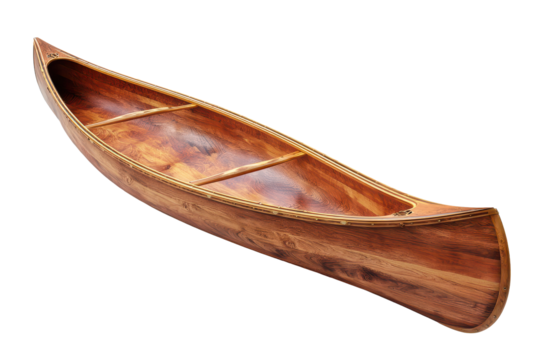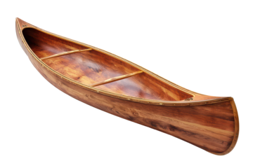 Wooden canoe boat with polished wood grain finish, streamlined hull shape and visible seat supports with smooth varnished highlights, isolated on transparent background.