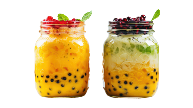 two contrasting bubble teas, a mango slushy and iced milk tea, highly detailed with condensation and boba pearls, isolated on a transparent background with copy space. concept for beverage
