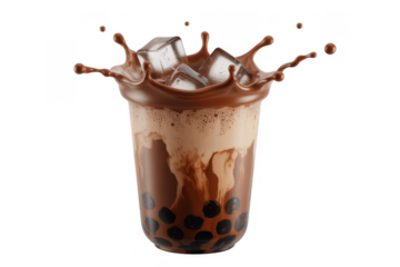 Chocolate milkshake with boba and ice cubes bubble tea drink isolated on a transparent background