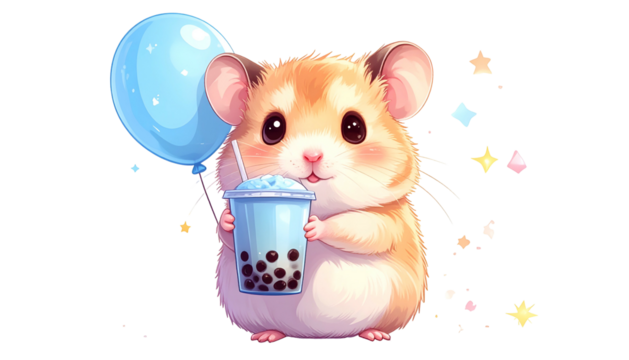 Adorable cartoon hamster holding a boba tea and balloon, surrounded by sparkles