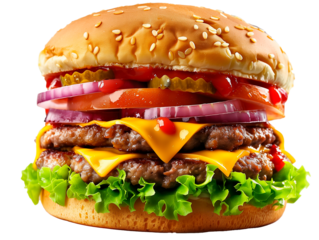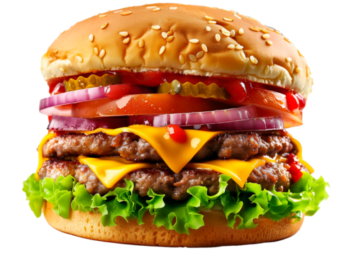 Hamburguesa doble con queso lechuga tomate y cebolla sobre fondo transparente