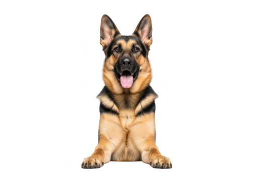 German shepherd dog sitting down looking forward isolated on transparent background
