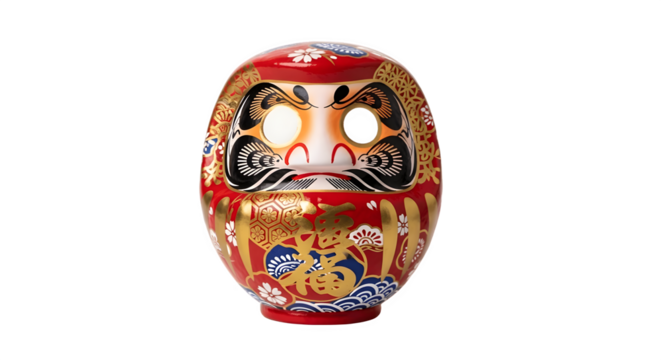 A vibrant red Japanese Daruma doll with golden accents and a prominent kanji, representing good luck, perseverance, and goal-setting traditions. background removed