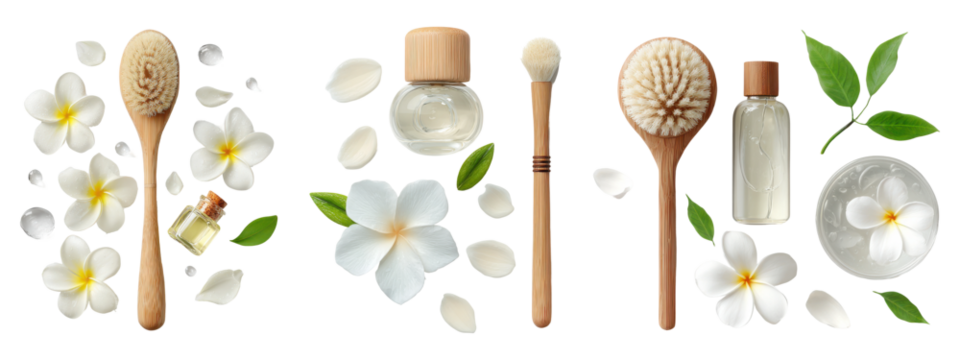 Spa and wellness flat lay compositions with body brush, essential oil, and white frangipani flowers.