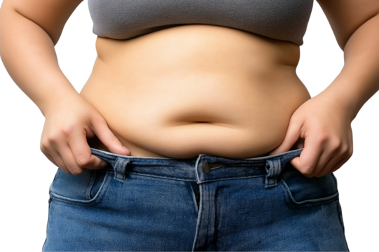 Woman pinching excess belly fat isolated on a transparent background 1