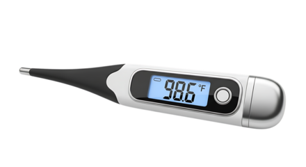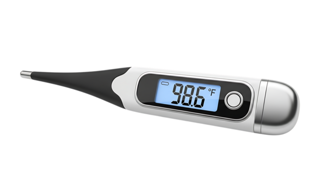 Digital thermometer displaying a normal body temperature of 986 degrees fahrenheit, isolated on transparent background