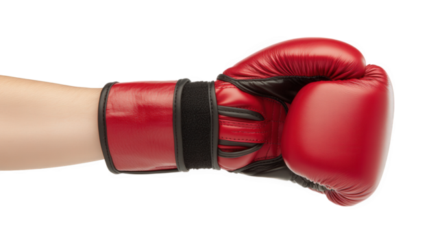 Closeup of a red boxing glove isolated on transparent background, showcasing its leather texture, black wrist strap, and the fist ready for action in the ring