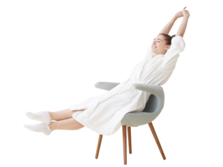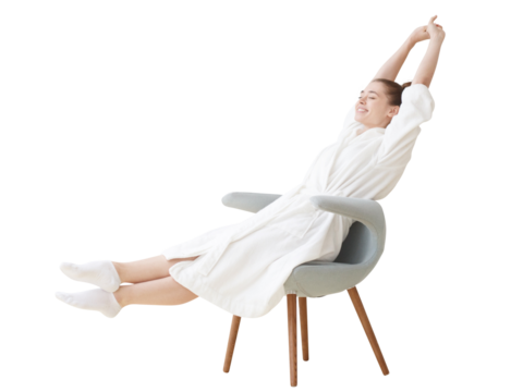 Relaxed young woman in a white bathrobe stretching her arms overhead while sitting comfortably in a chair in the morning after waking up