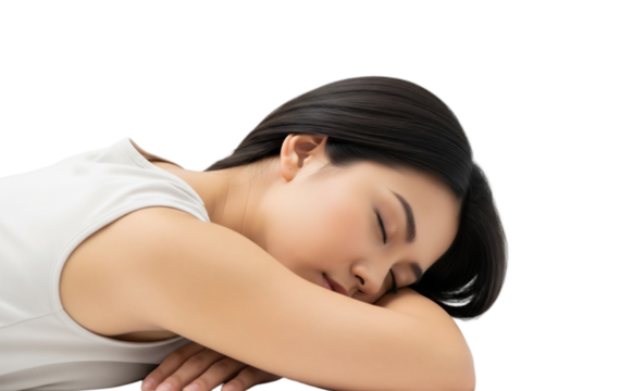 A young Asian woman with long black hair rests her head on her arms. She has a peaceful expression, eyes closed, against a transparent background.