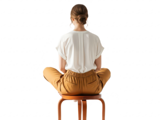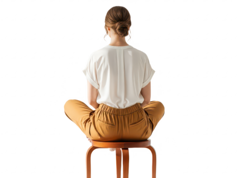 Woman sitting on a stool with back to camera, relaxed pose, isolated on transparent background