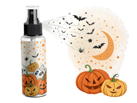 Spooky Halloween spray bottle conjuring festive pumpkins, bats, and a glowing moon for fall fun,isolated on white background