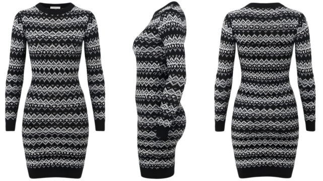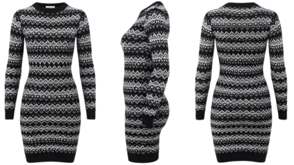Black and white patterned long sleeve knitted sweater dress shown from front, side, and back views isolated on transparent background