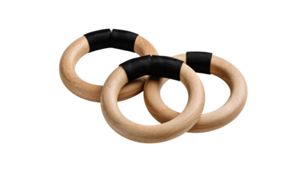 Three wooden gymnastic rings, each with a black band