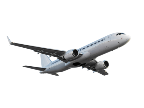 A passenger airplane, in a dynamic flight pose, isolated on a white background