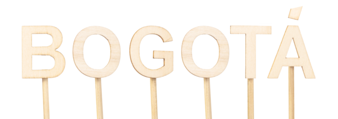 Wooden name of Bogota, capital of Colombia, isolated on minimalist white background. Tourism concept