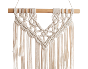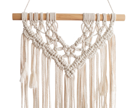 Macrame wall hanging with geometric diamond pattern and fringes, isolated on transparent background, adding a touch of bohemian style to interior design