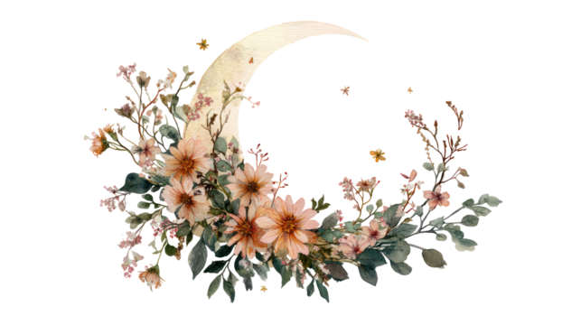 Watercolor floral crescent made of wildflowers and vines on white background