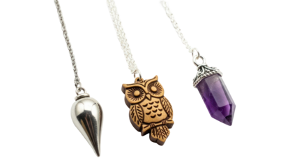 Three Pendants: Pendulum, Owl, Crystal isolated on transparent background