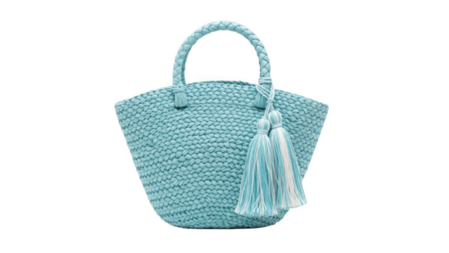 Light turquoise woven straw tote handbag with braided handles and decorative tassels, stylish summer beach and vacation bag for women, boho coastal fashion accessory isolated on white background