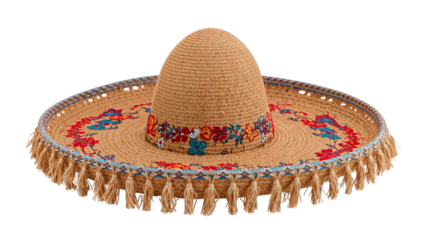 Traditional mexican sombrero with colorful embroidered flowers and tassels, isolated on the transparent background