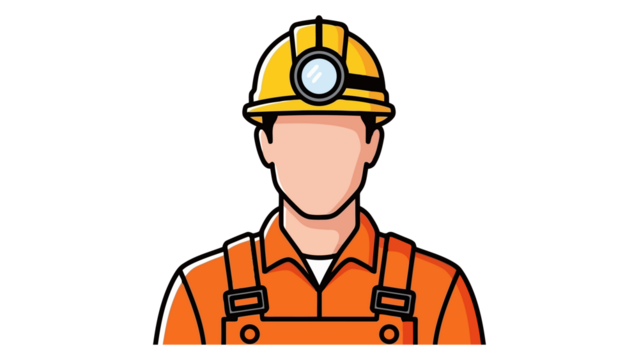 Cartoon miner wearing yellow hard hat with headlamp and orange overalls