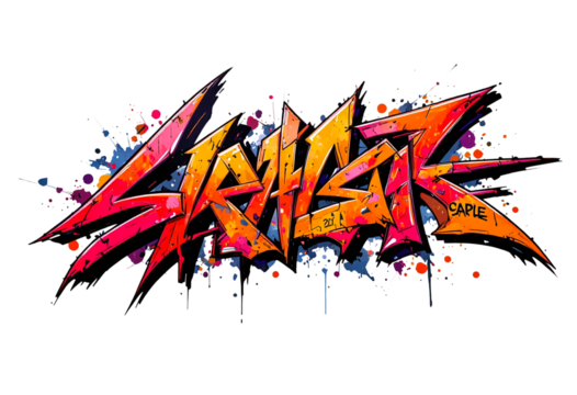 Stylish graffiti text splash logo with bold urban typography design isolated on white background
