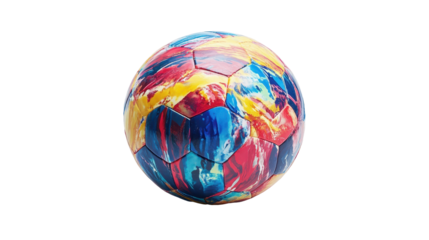 A vibrant, multicolored soccer ball displaying bold hues of blue, red, and yellow.