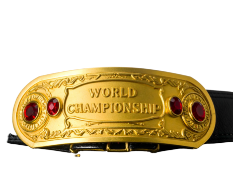 A gold championship belt with red jewels, black strap, and the words "World Championship