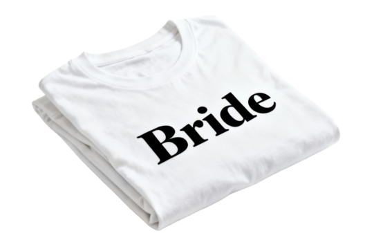 Crisp white t-shirt with bold 'Bride' text, ready for wedding celebrations