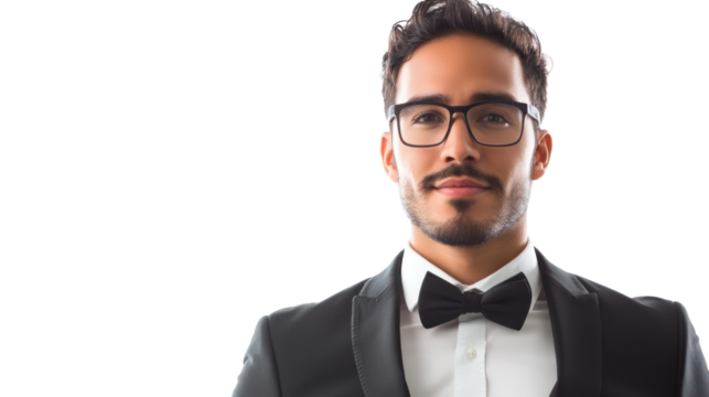 Portrait of a confident man wearing a tuxedo and glasses, set against a white background, exuding elegance and professionalism.