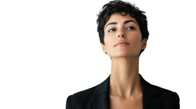 A confident young woman in a tailored black suit, looking up thoughtfully against a clean white background, embodying professionalism and poise.