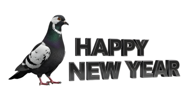 Pigeon standing beside bold metallic three dimensional text wishing happy new year on black