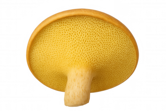 Underside of a bolete mushroom, yellow porous surface of a fungus cap and stem, biology, mycology, nature