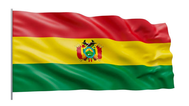 Bolivian flag waving in the wind. The flag features three horizontal stripes: red, yellow, and green, with the coat of arms in the center.