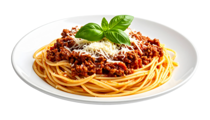 Delicious spaghetti Bolognese topped with grated cheese and a fresh basil leaf, served on a white plate isolated on solid white background in Png