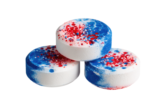 Three round, white bath bombs, stacked.  Red and blue swirls and sprinkles