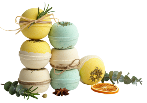 Artisanal bath bombs (yellow, off-white, green, blue-grey) featuring rosemary, dried orange, raffia, on white backdrop with copy space, soft studio light, luxury organic skincare concept