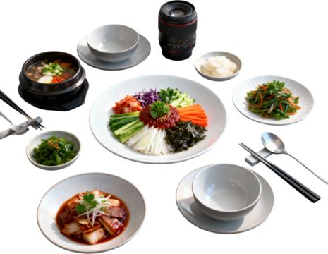 A vibrant and appetizing spread of various dishes, showcasing grilled meats, vegetables, rice, and side options artfully arranged on a plate.,Isolated on transparent background
