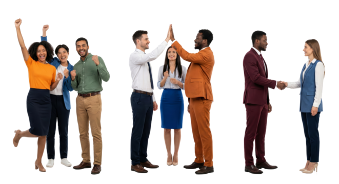 Diverse group of professionals celebrating successful teamwork on isolated transparent background