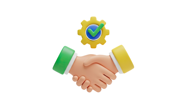3D illustration of handshake with gear and checkmark icon on transparent background