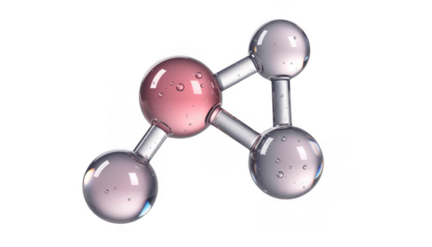 3D molecular structure model with pink and clear balls on black isolated on a transparent background