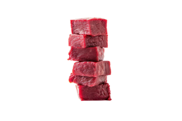 Raw beef meat cubes scattered across a white surface, like dice on a game board, isolated on white background