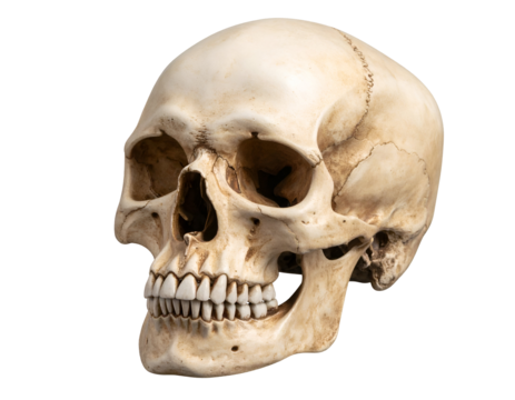 A human skull with detailed bone structure represents mortality isolated on transparent background